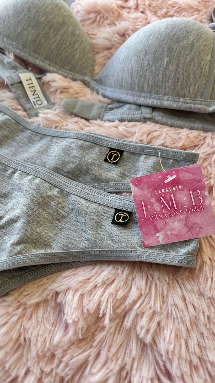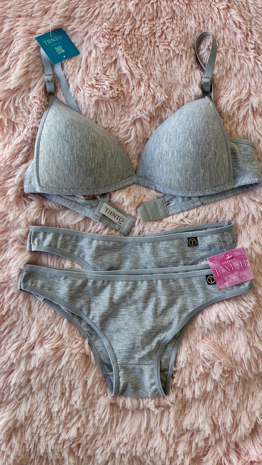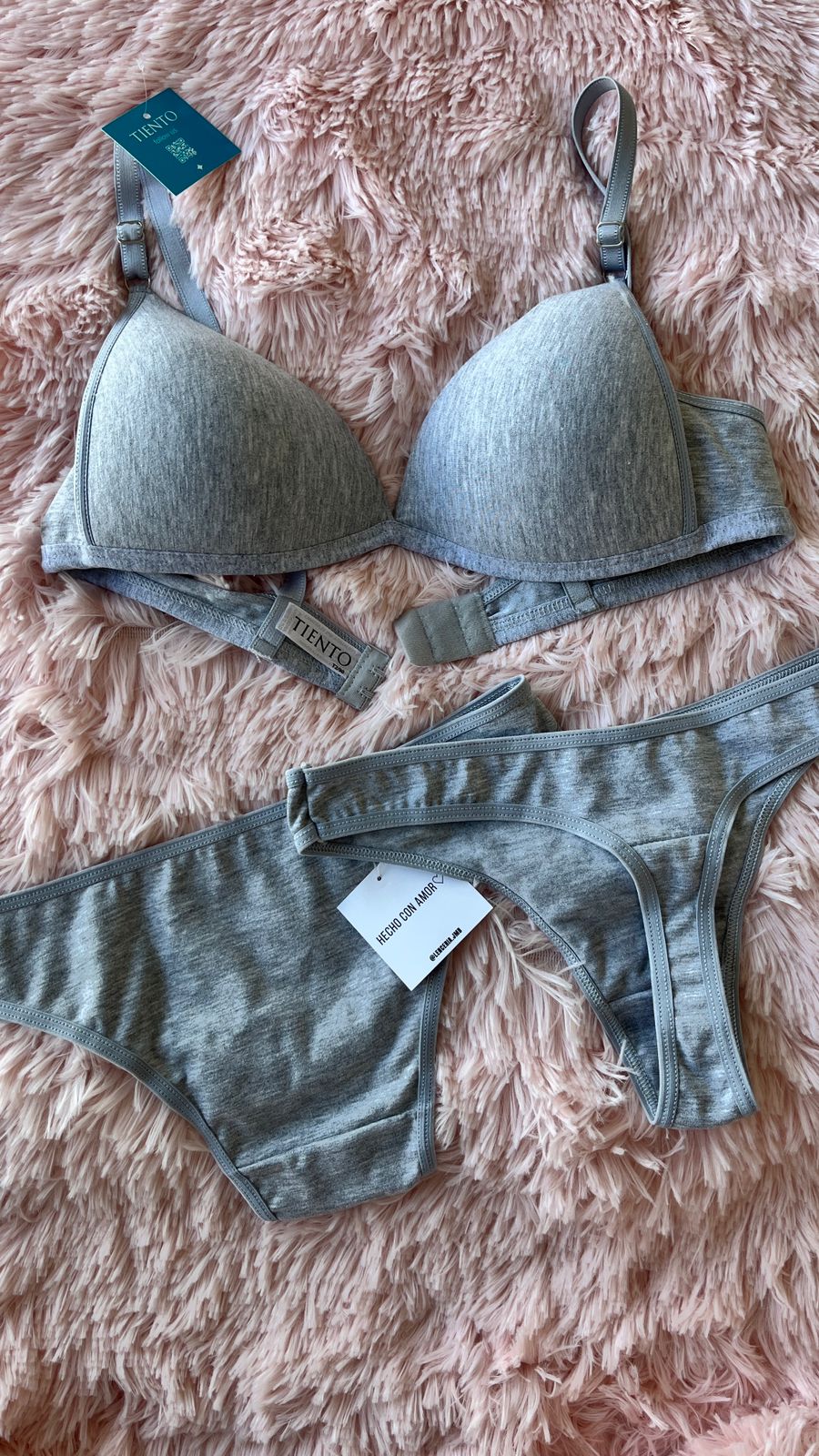Conjunto 3 piezas triangulo taza soft, gancho en espalda y tiene arandelas de metal con baño hipoalargenico. Junto a una colaless y una vedetina. Realizado en algodón y lycra.